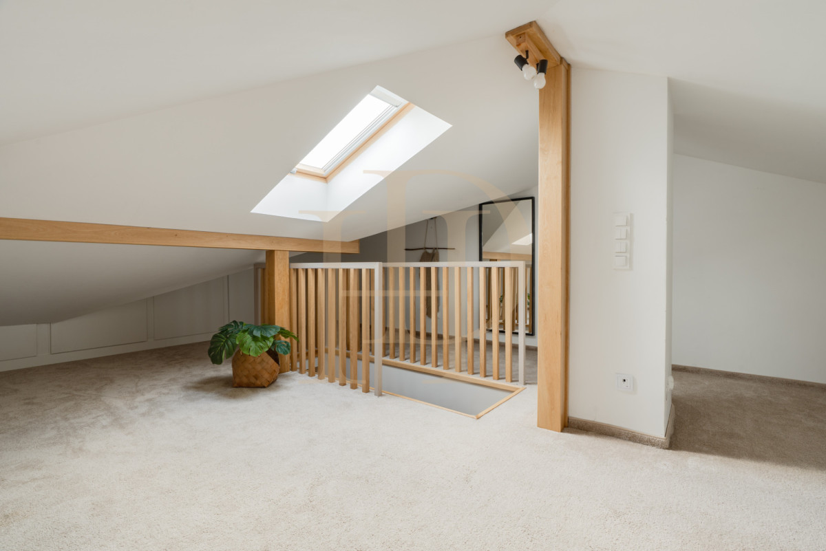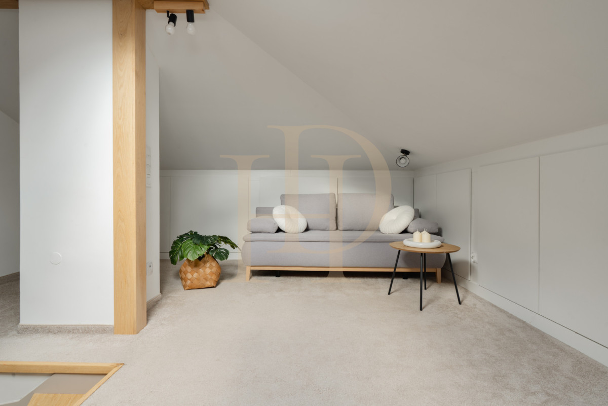 Na poddaszu znajduje się otwarta, nastrojowa przestrzeń – idealna na sypialnię, strefę relaksu lub domowe biuro.